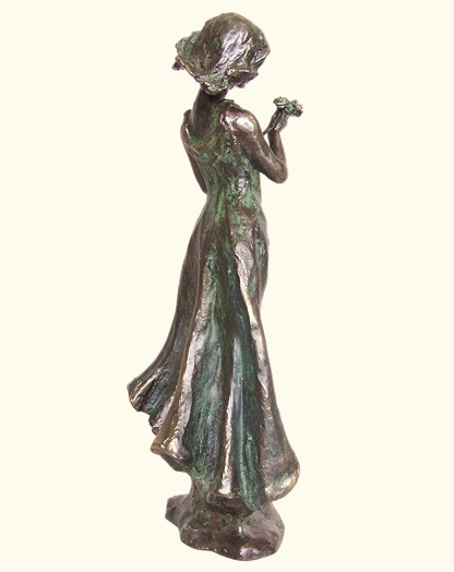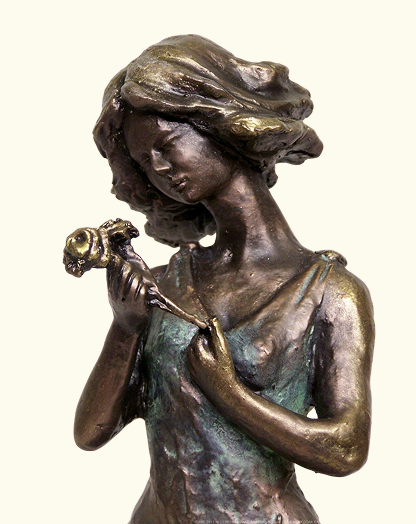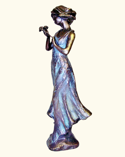 Escultura figurativa de mujer sosteniendo una rosa en su mano, figura de bronce sintético en venta SI ESTÁ INTERESADO EN ESTA ESCULTURA, POR FAVOR CONTÁCTENOS (ver PIE DE PÁGINA o SOBRE en la esquina superior derecha de esta página)